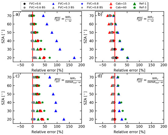 Comparison of SIF escape probability estimated using SIT (i.e., ) with reference values that were simulated by DART (i.e., ). The calculation formula of was shown in each sub-plot. in the first column (a,c) were estimated using NIRT; while in the second column (b,d) using NIRv. in the first row (a,b) were estimated using io; while in the second row (c,d) using fraction of absorbed photosynthetically active radiation (fAPAR). BS means black soil (i.e., non-reflecting background). Relative error was calculated as ()/.