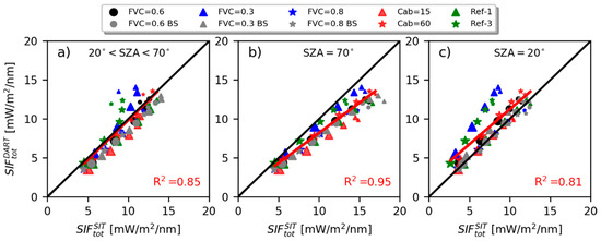We further calculated total emitted SIF () using the estimated SIF escape probabilities () mentioned above. Here only the results of were used to estimate (corresponding to the in Figure 4b). in Figure 5a was calculated using specific SIF escape probabilities () that were estimated at varying solar zenith angles from 20° to 70°. While for Figure 5b,c, was calculated using constant SIF escape probabilities () estimated at a fixed solar zenith angle (i.e., SZA = 70° and SZA = 20° for (b) and (c), respectively). In other words, SIF escape probabilities () estimated at SZA = 70° or SZA = 20° were used to assess other cases when solar zenith angles change from 20° to 70°. It is clear that estimated at high solar zenith angles produces higher accuracy (R2 = 0.95) of than that estimated at varying solar zenith angles (R2 = 0.85) and low solar zenith angles (R2 = 0.81).