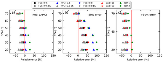 Comparison of SIF escape probability estimated by SIT and using leaf area index (LAI) and clumping index (CI) as input for the estimation of canopy interceptance (i.e., ) with reference values that were simulated by DART (i.e., ). ‘Real’ LAI*CI was used to plot (a). Additional −50% and +50% errors of LAI*CI were introduced to plot (b,c). Relative error was calculated as ()/.