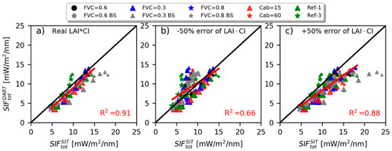 Comparison of the total emitted SIF () using different SIF escape probabilities with DART reference values (). (a) Plot using estimated with ‘real’ LAI*CI; (b,c) plots using estimated with additional errors of LAI*CI: −50% error of LAI*CI for (b); +50% error of LAI*CI for (c).