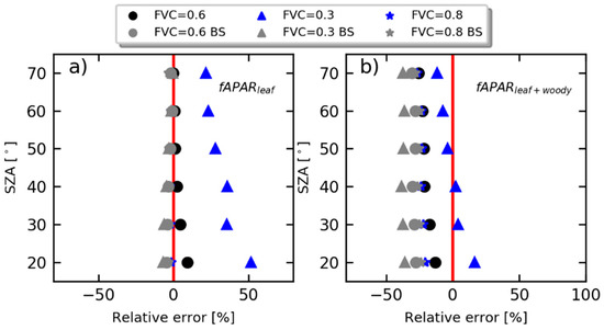 Comparison of SIF escape probability estimated by SIT using fAPARleaf (a) and fAPARleaf+woody (b) as input parameter with reference values that were simulated by DART (i.e., ). Relative error was calculated as ()/.