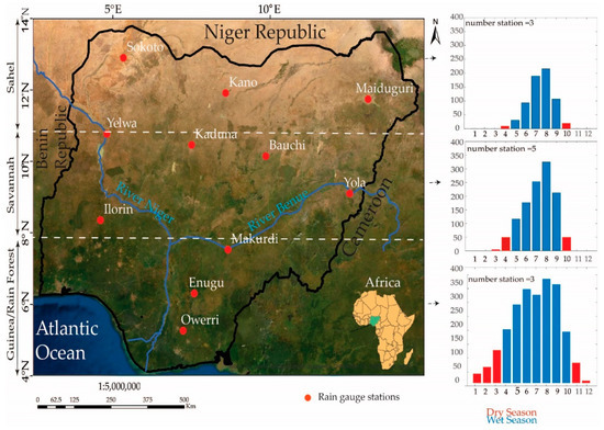 Annual precipitation varies from about ≤900 mm/year in the northern region to over 4000 mm/year in the southern part. Nigeria can be divided into three main climatic zones: (i) the Guinea Coast (4°–8°N), (ii) the Savannah (8°–11°N), and (iii) the Sahel (11°–16°N) [49,50] (Figure 1). Precipitation starts around March/April in the Guinea region and ends by October each year. However, in both Savannah and Sahel regions, precipitation sets off around May/June and ends in September (Figure 1). The Guinea and Savannah areas experience double maxima, with a small break in August (Figure 1), known in Nigeria as August break [51]. It is worth noting that generally in Nigeria, precipitation is governed by the actions of the West African monsoon, characterised by variations in the maritime and continental air masses, referred to as south-westerly and north-easterly winds, respectively [52]. This monsoon action summarises the known rainfall regime known in Nigeria.