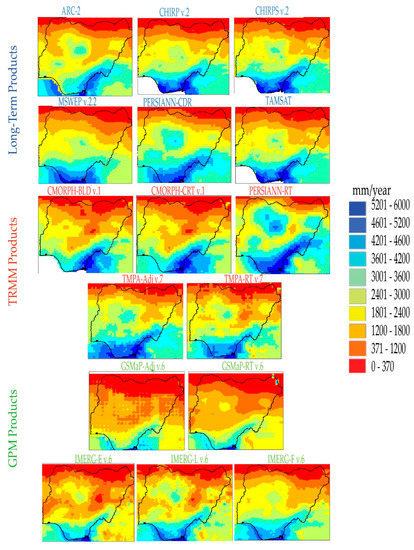 The long-term SPPs merge reanalysis datasets derived from physical and dynamical models with satellite-based precipitation estimates. The reanalysis datasets are available for a larger temporal window than the PMW and IRs sensor used for TRMM and GPM SPPs. Therefore, the long-term SPPs offer more extensive temporal coverage than TRMM and GPM SPPs. Generally, the relationship between reanalysis datasets and satellite-based precipitation estimates from TRMM SPPs and IR-based precipitation estimates are known for a standard period of observation. This information encourages retrospectively reanalysed estimates of past precipitation events. Finally, it is worth mentioning that most of the considered SPPs also include a gauge-based precipitation dataset to calibrate the precipitation estimates. Therefore, the 16 considered SPPs include (1) only satellite-based SPPs (PERSIANN-RT, TMPA-RT v.7, IMERG-E, and -L v.6), (2) satellite-based SPPs adjusted with gauge information, such as TMPA-Adj v.6, IMERG-F v.6, CMORPH-CRT and -BLD v.1, TAMSAT v.3, and ARC-2, and (3) SPPs including both satellite and reanalysis datasets with or without gauge adjustment (CHIRP v.2, CHIRPS v.2, PERSIANN-CDR, and MSWEP v.2.2).