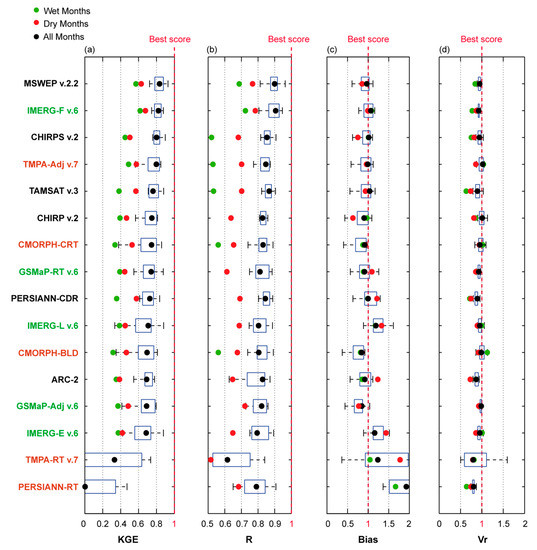 Box plot statistical summary of (a) Kling–Gupta efficiency (KGE), (b) correlation coefficient (r), (c) bias (β), and (d) variability ratio (Vr), based on the sixteen SPPs and eleven gauging stations across Nigeria. The performances in terms of KGE, correlation coefficient, bias, and variability ratio of all SPPs across all months are highlighted in black, while their seasonal performances are highlighted in green and red for the rainy and dry seasons, respectively. The SPPs in black represent the long-term group, while the Tropical Rainfall Measuring Mission (TRMM) is in red and the Global Precipitation Mission (GPM) is in green.