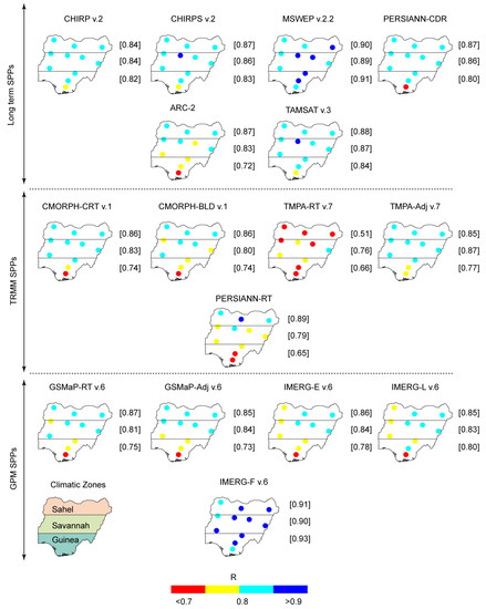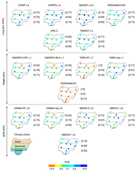 It is worth mentioning here that Figure 10 presents the best SPP in term of KGE. However, as shown in the results section, the most efficient SPP changes according to the considered variables (i.e., KGE, r, β, and Vr). For instance, the most efficient SPPs in term of bias are IMERG-F v.6 and PERSIANN-CDR across the Sahel region, CHIRPS v.2 and MSWEP v.2.2 across the Savannah region, and CHIRP v.2 and TMPA-Adj v.7 across the Guinea region. Therefore, interested users should select different SPPs in agreement with the foreseen use.