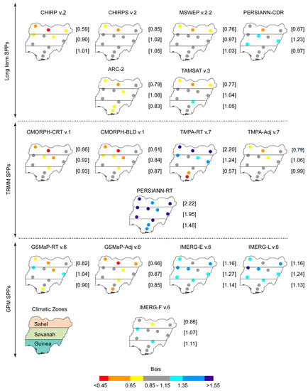 In general, all SPPs underestimated precipitation in the northern Sahel region. As the correlation is generally higher for this region, it seems that the SPPs correctly captured the temporal occurrence of precipitation event but still underestimated the amount. This might come from specific short-term and light precipitation events occurring across the arid region, which is challenging for SPP retrieval methods [67,68]. However, it is worth mentioning here that an equivalent bias expressed in mm equals a different relative bias (Equation (3)) if considering high or low precipitation amounts. Therefore, the same bias (in mm) will result in higher relative bias over the Sahel than the Savannah or Guinea regions. The differences could partially explain the higher bias value observed over the Sahel region.