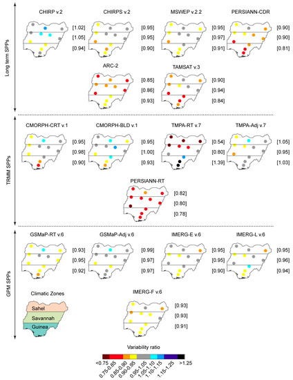 Regarding the Vr values, all SPPs underestimated precipitation variability, particularly PERSIANN-RT and TMPA-RT v.7, and to a lesser extent ARC-2, TAMSAT v.3, and PERSIANN-CDR. The other SPPs presented reasonable Vr values. Interestingly, the gauge-based adjustment led to contradictory results depending on the considered SPPs. Indeed, IMERG-F v.6 had a lower Vr value than the non-adjusted version (IMERG-E and -L v.6), whereas both TMPA-Adj v.7 and GSMaP-Adj v.6 have Vr values closer to one compared to their non-adjusted versions (TMPA-RT v.7 and GSMaP-RT v.6).