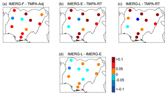 Figure 9 shows the difference in KGE values obtained at each grid cell between IMERG and TMPA SPPs. IMERG and TMPA datasets were compared, taking into account their available time latency. Therefore, IMERG-E and -L v.6 (time latency of 4 and 12 h, respectively) were compared to TMPA-RT v.7 (1 day latency) (Figure 9b,c), whereas IMERG-F v.6 (latency of 3 months) was compared to TMPA-Adj v.7 (3 months’ latency) (Figure 9a). Finally, IMERG-E and -L v.6 were also compared (Figure 9d). GSMaP-RT v.6, GSMaP-Adj v.6, CMOPRH-CRT v.1, CMORPH-BLD v.1, and PERSIANN-RT were not considered for comparison because their overall reliability is lower than IMERG and TMPA datasets (Figure 4). IMERG-F v.6 reaches higher KGE values than TMPA-Adj v.7 at nine out of 11 grid cell locations (Figure 9a). The same was observed when comparing IMERG-E v.6 and -L v.6 to TMPA-RT v.7 (Figure 9b,c). These results highlight a significant enhancement in precipitation estimates from TRMM to GPM SPPs. This finding is consistent with previous results reported in Bolivia [30], Brazil [37,38], and Pakistan [26]. Finally, IMERG-E v.6 and IMERG-F v.6 show a strong agreement with an absolute difference inferior to 0.05 at 10 out of 12 gauge locations (Figure 10d). Therefore, for real-time requirements, IMERG-E v.6 could be used instead of IMERG-L v.6 to obtain faster access to precipitation estimates across Nigeria (4 h instead of 12 h).