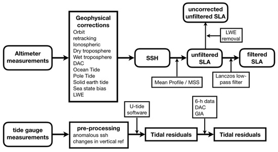 Flowchart of the Data Unification and Altimeter Combination System (DUACS) procedure applied to altimetry data and the processing of the tide gauge data used to compare with altimetry.