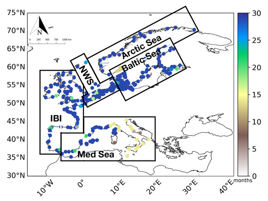 The time period analysed spans from May 2016 to September 2018. The areas investigated are the whole European coast, the Baltic Sea, the Arctic Sea, North-West Shelves (NWS) region, the Iberian-Biscay-Irish (IBI) region, and the central-western Mediterranean Sea (Figure 2).
