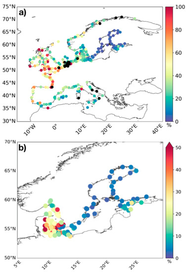 Spatial distribution of the mean square differences between the tide gauge and altimetry sea level from Sentinel-3A in the European coasts (panel (a)). Black dots denote the location of the tide gauge sites rejected from the computation according with the selection criteria described in the text. Panel (b) shows a detailed view of the Baltic Sea region. Sea Level Anomaly (SLA) measurements without filtering have been used. Units are the percent of tide gauge variance.