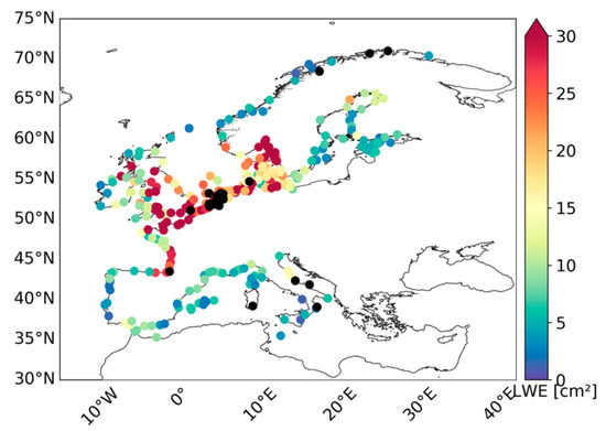 Spatial distribution of the variance (cm2) of Long Wavelength Error (LWE) correction applied on SLA measurements (without filtering) from the Sentinel-3A dataset along the European coasts. Black dots denote the location of the tide gauge sites rejected from the computation according with the selection criteria described in the text.