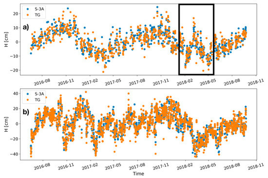 Time series of SLA (cm) obtained from the Sentinel-3A most correlated track points (blue dots) and tidal residuals (orange dots) time series at each station site for (a) the Mediterranean basin and (b) the Baltic Sea. Black square denotes the time period showing a second maximum in 2018 for SLA. The mean value of each time series has been subtracted for comparison purposes.
