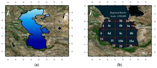 (a) Spatial position of the Caspian Sea (CS) and (b) The spatial subsetting of the Southern Caspian Sea (SCS) based on Iran’s National Cartographic Center guidelines. The temporal variability in bio-optical properties is communicated for each block.