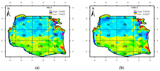 Figure 2 illustrates only the areas with a significant trend in pixel. To evaluate the contextual Mann–Kendall (CMK) test, the results were compared to the Mann–Kendall (MK) test in which the contextual information is unconsidered.