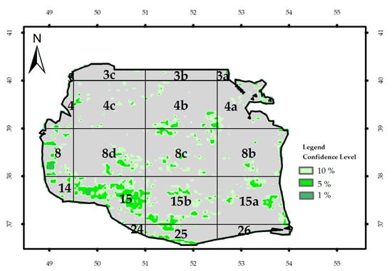 The pixels with no significance in the MK test became significant when taking into account the adjacent pixels, with a significance level 0.05 (Figure A4). Most of these pixels belong to blocks 25 and 26 and 14 and 15 (the southwestern region), 15a (the western region), and 15b (the eastern region). The MK and regional MK tests were different concerning the attenuation coefficient and p values smaller than 0.001.
