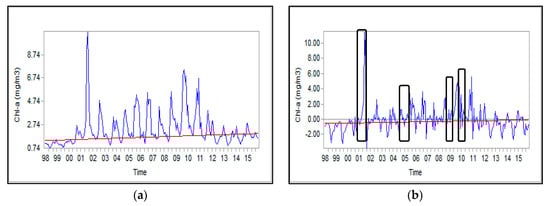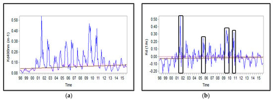 The Theil-Sen slope estimator represents the concentration of Chl-a at the end of the trend relative to the beginning. The observed positive anomalies in time series might be ascribed to unexpected events such as harmful algal bloom; the results are consistent with those reported by []. As shown in Figure 5 and Figure 6, the concurrent unusual increase in Chl-a concentration could be justified the observed positive correlation between Chl-a concentration and attenuation coefficient.