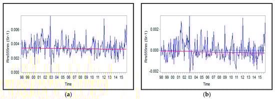Impurity is a common problem in time-series analyses. The problem can be solved by using regional geographical information on the impurities, and this method is a nonparametric test, which is on the basis of spatial autocorrelation []. The prewhitened time-series are analyzed in depth, but the incorporation of adjacent pixels leads to higher variance scores, a situation that is susceptible to reject the null hypothesis (i.e., no trend).