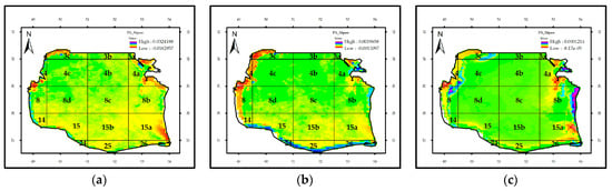 Furthermore, the middle trend analysis of Rrs_555nm revealed that RSR underwent smaller variation rates in central blocks than in the eastern blocks. In eastern parts, the maximum variation rate of RSR was related to block 15a, with being a negative value (Figure 8c).