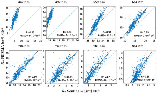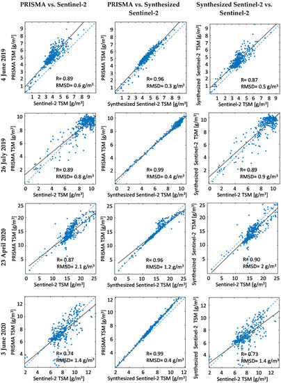 | PRISMA vs. Sentinel-2 | PRISMA vs. Synthesized Sentinel-2 | Synthesized Sentinel-2 vs. Sentinel-2 | ||||||||||