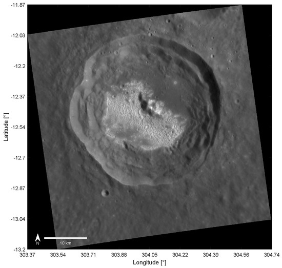 All data used in this work were captured by instruments onboard NASA’s MESSENGER spacecraft, primarily the Mercury Dual Imaging System (MDIS) [8]. MDIS consisted of a Wide Angle Camera (WAC) and a Narrow Angle Camera (NAC), which shared the same pivoting platform [46]. While NAC captured only monochrome images centered near 750 , WAC contained a mechanical filter wheel with 12 filters in the visible and near-infrared, ranging from 430 to 1020 [8]. In this work, we use either NAC images or WAC images with filter 7 (WAC-G) because the filters have approximately the same center-wavelength of 750 [46]. The original images are available in the NASA Planetary Data System (PDS). The images are calibrated with the Integrated Software for Imaging Spectrometers (ISIS) [47,48,49]. Because the images have a maximum size of 1024 × 1024 pixels, single high-resolution images only cover small areas of the surface. To investigate contiguous surface features, individual images are combined into mosaics.