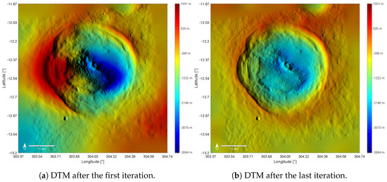 In contrast to the image examined in Section 3.1, the challenge for the SfS method in this case is not the albedo of the surface but the large incidence angles at higher latitudes. Although these circumstances make it easier to identify fine surface features in the ghost crater, the shadows in the superimposed craters impair the reconstruction. The stereo DTM 36E60N_0 [29] with a nominal resolution of 55 m/pixel is chosen for comparison. The resolution of the mosaic of WAC images is about 2.8 times coarser. For the initialization of the SfS procedure, a section of the DLR DTM of the quadrangle H05 [65] is chosen. Contrary to the initial stereo DTM, the SfS algorithm reconstructs the shape of the superimposed craters (see Figure 10a). The graben that run through the ghost crater are also only visible in the SfS DTM (compare the centers of Figure 10a,b). A problem that occurs in both methods is the preferred direction of the reconstruction. In the initial DTM, the crater walls on the eastern and western sides are elevated and indentations are visible on the northern and southern walls. In the SfS DTM, the northern and southern walls are unrealistically elevated instead. In the case of the SfS DTM, this is due to illumination from a south-southwest direction. The use of several images with different illumination conditions could potentially compensate for this effect.