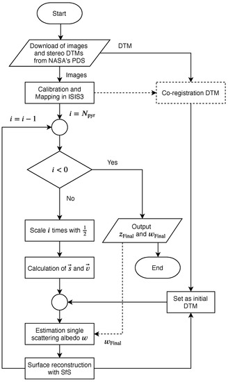The workflow of the entire 3D reconstruction process of Mercury’s surface is shown in Figure 6. After defining a target area, suitable MDIS images are radiometrically calibrated with ISIS3 [48]. The iterative pyramid scheme begins with the downscaled image and initial DTM, for which we choose one of the stereo DTMs described in Section 1 and Section 2.1. If necessary, the initial DTM is manually co-registered with the calibrated image or mosaic. After estimating the albedo, the SfS algorithm calculates the surface heights. The resulting DTM is used to initialize the next stage. After running through a predefined number of pyramid levels, the resulting DTM and albedo map are of the same resolution as the original image or mosaic. can be used as an initialization for a new run if required.