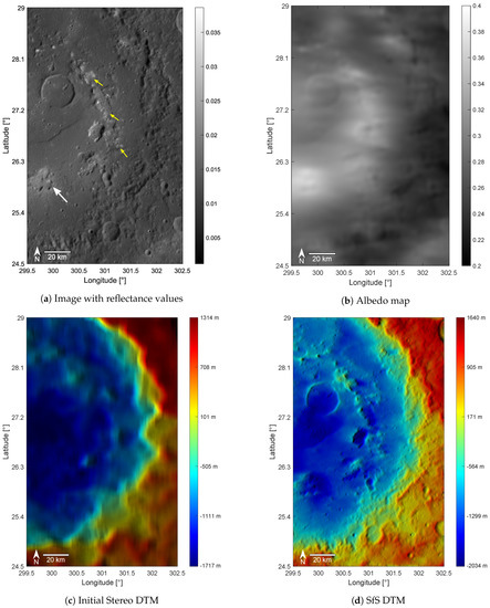 - Grumpe, A.; Belkhir, F.; Wöhler, C. Construction of lunar DEMs based on reflectance modelling. Adv. Space Res. 2014, 53, 1735–1767. [Google Scholar] [CrossRef]