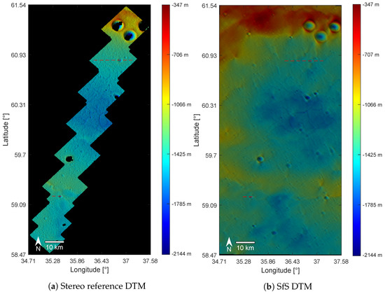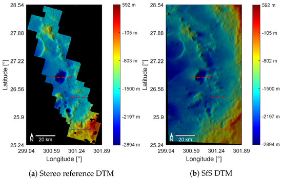 Comparison of the (a) reference DTM [29] to the (b) SfS DTM. The profiles indicated by the red dashed lines are investigated in Figure 12 from top to bottom. To allow for the comparison, the stereo DTM is scaled to the size of the SfS DTM.