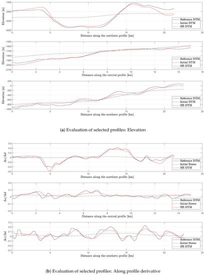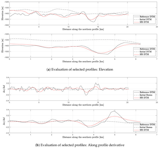 The elevations and derivatives along the northern and the southern profile marked in Figure 11 are shown in Figure 12. The vertical offset of the SfS and initial DTM profiles is adjusted again by minimizing the RMSE. The final RMSE for both, height and derivative along the profile, is given in Table 6. The profiles illustrate the capability of the SfS algorithm to reconstruct surface features, even if they are of a small lateral size. In Figure 11a, the SfS DTM follows the shape of the reference DTM, while the initial DTM does not. Only on the first and last 5 km of the upper profile a deviation is apparent. On the right-hand side, the shape of the surface is estimated correctly, but not the absolute height. In the lower profile, the SfS algorithm modeled the crater very accurately. The derivatives along the profiles (Figure 11b) support this conclusion. The derivative of the southern profile can be seen as correctly reconstructed, considering the difference in resolution. The large proportion of high frequencies complicates the qualitative comparison of the derivatives along the northern profile. However, the low RMSE of indicates good modeling.
