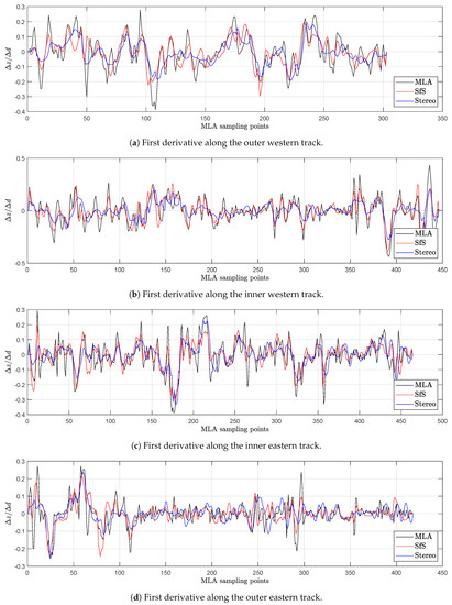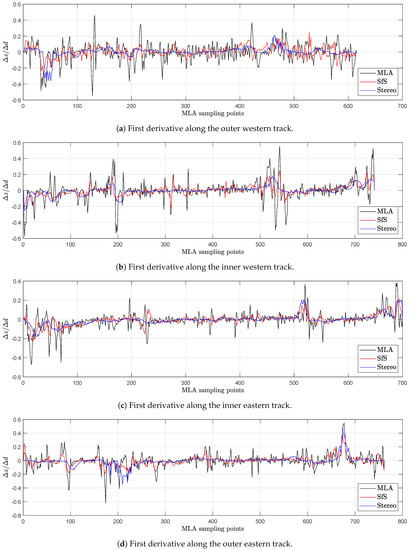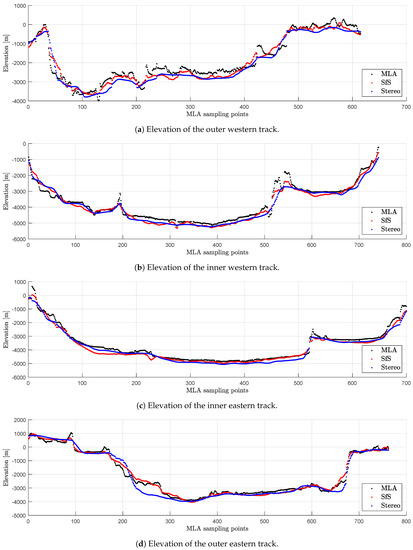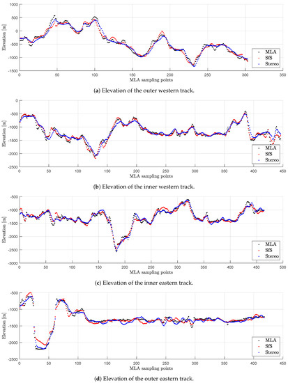 The horizontal resolution of DTMs derived from MLA data and the effective resolution of MLA measurements themselves generally do not match the resolution that SfS can provide. A meaningful evaluation is therefore only possible in a resolution range between MLA footprint size (about 15 to 100 [33]) and distance between sampling points (about 400 [33]). This ensures the assignment of one MLA measurement to roughly one SfS pixel. We chose to directly compare our SfS results to the sampling points instead of comparing them to gridded DTMs derived from MLA data. This ensures that we compare to a measured value instead of an interpolated point. Consequently, SfS DTMs with a resolution between the footprint size and the sampling interval are chosen to carry out the comparison. The MLA tracks and the SfS DTM are co-registered, and a vertical offset may be removed by minimizing the RMSE. Finally, we calculate the RMSE of the height differences and the RMSE of the first derivatives along the track. The limitations of the method are critically discussed in Section 4.3.