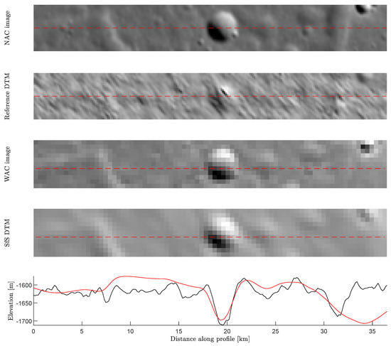 Sections of the DTMs in Figure 11. The DTMs are compared to the corresponding image parts. In the case of the stereo DTM, the original image is an orthophoto from NAC images [29], and, for the SfS DTM, it is the mosaic of WAC images. Below that, the elevation of the profile (red dashed lines) over the length of the section is shown. The SfS DTM is drawn in red and the stereo DTM in black.