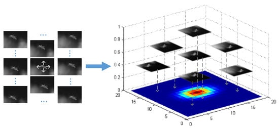 By implicitly including dense samples, the correlation filters are able to make full use of limited training data []. Motivated by the training mechanism of correlation filters [,], we explicitly construct shifted versions of the aircraft in the initial frame as the training data without requiring additional training data. To ensure a better tracking performance, we integrate handcrafted features that encode general representation into the network. The learned domain-specific features and handcrafted features can co-adapt and cooperate to achieve an objective.
