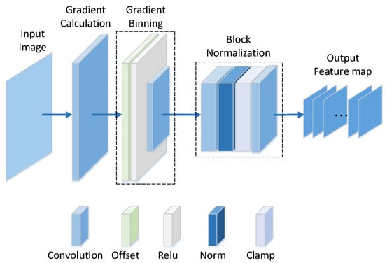 where is the projection of the gradient g along direction . The cell histogram is calculated in 8 × 8 pixels and normalized in a block composed of 2 × 2 cells. The network architecture is shown in Figure 3. The norm layer is a special case of the Local Response Normalization (LRN) layer [], and the clamp implements the function,