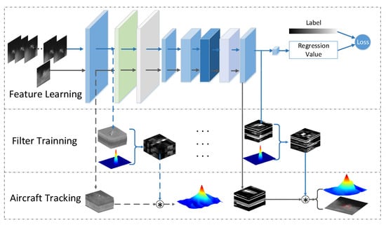 In the typical formulation of the correlation filters, the correlation filters are trained by solving a linear least-squares problem. The training samples are implicitly generated by performing a circular sliding window operation and exploiting the fast Fourier transform [,]. The adopted features in the correlation filters are usually handcrafted features or CNN features pre-trained on large datasets, which are not tightly bound to the current video domain. Inspired by the training mechanism of correlation filters, we explicitly construct shifted versions of the aircraft in the initial frame as the training data and try to obtain features for the current domain in a convolutional regression network. The training of the network is consistent with the training of correlation filters. Therefore, the features obtained from the network are tightly coupled with both the current video domain and the tracking frameworks based on correlation filters. Learning the weights w of the network is to minimize the following loss function,