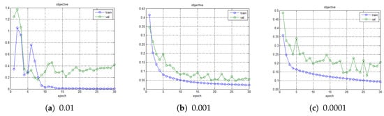 We construct shifted versions of the aircraft in the initial frame to obtain 256 training samples as the training data. The corresponding labels are assigned according to Equation (2). We follow the initial parameter settings of the network. The number of orientations is set to 18, and the threshold value in Equation (8) is 0.2. We iteratively apply the Stochastic Gradient Descent (SGD) optimizer with a batch size of 16. The setting of the learning rate is highly related to the loss curve. Therefore, we conduct learning rate experiments of different orders of magnitude and randomly select 30 percent of the samples from the training set as the validation set. The corresponding loss curves are shown in Figure 6. If the learning rate is set to 0.01, it is difficult for the loss function to converge. The loss function will converge slowly with a learning rate of 0.0001. To this end, we set the learning rate to 0.001 to make the loss function converge more smoothly and quickly. The training is stopped after 10 epochs since the loss value decreases little after that, as shown in Figure 6b. After the network is trained, the features from the network are integrated into the correlation filter tracking framework [,,]. The experiments were performed on a PC with an Intel i3-4030U 1.9 GHz CPU, and 4 GB of RAM.