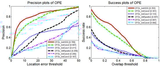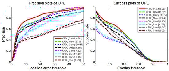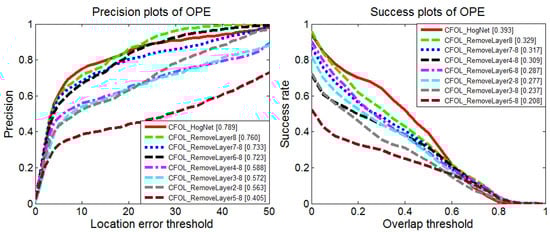 The features adopted in the correlation filter tracking framework play a critical role. We perform quantitative analysis to evaluate the use of features from different layers. We follow the evaluation metrics used in [,], which include the precision metric and the success metric, and follow the One-Pass Evaluation (OPE) protocol. The success metric is presented with plots, which show the ratios of successful frames changed with the overlap ratio between the tracked and ground-truth bounding boxes. The precision metric calculates the percentage of frames within a range of the center location error thresholds. Given tracking bounding box and ground-truth bounding box , precision P and overlap ratio R are defined as follows: