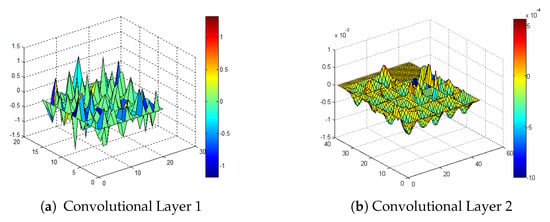 The initialization parameters of the network are obtained from the HOG features, as shown in Figure 4, and we further train the network by using Equation (1). The training process of the network is consistent with the training mechanism of correlation filters, as we mentioned in Section 3.1. After the network is trained, the feature maps from the network are integrated into the correlation filters for aircraft tracking. We denote the input image by x, and the corresponding feature is . Similarly, a correlation filter f is then learned by solving the following objective function: