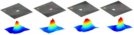 Thermal infrared technology can work under all types of weather conditions and has been widely used for rescue, surveillance, and automatic target recognition. Besides, tracking based on thermal infrared technology is not sensitive to illumination variations and can track the target in total darkness [,]. Airborne target tracking, which plays an important role in infrared imaging guidance, remains a challenging task [,]. Compared with visual tracking, the imagery generated by infrared imaging guidance has low resolution and lacks texture information []. Moreover, both aircraft and infrared imaging platforms are highly maneuverable, leading to strong ego-motion and severe image jittering []. When an aircraft passes through a cloud, the aircraft would be partly occluded by the cloud. At the same time, the infrared decoy can also lead to occlusion and radiate a stronger signal than the aircraft. The change in aircraft attitude will give rise to the difference of imaging, which is also a challenge for aircraft tracking, as seen in Figure 1.