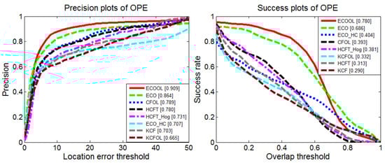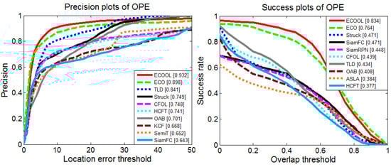 where and are the center coordinates of the tracking bounding box and ground-truth bounding box , respectively. For each frame, we can calculate the precision P and overlap ratio R. Given a precision threshold , the percentage of frames within the threshold can be computed. We change the threshold to calculate the corresponding percentage of frames. Thus, we can plot the percentage of frames varying with the threshold , which is called the precision plot. Similarly, we can plot the percentage of frames changing with the threshold to obtain the success plots. The precision score and the overlap score adopt thresholds and with 20 pixels and 0.5 to measure the percentage of the frames, which is consistent with the parameter settings in [].
