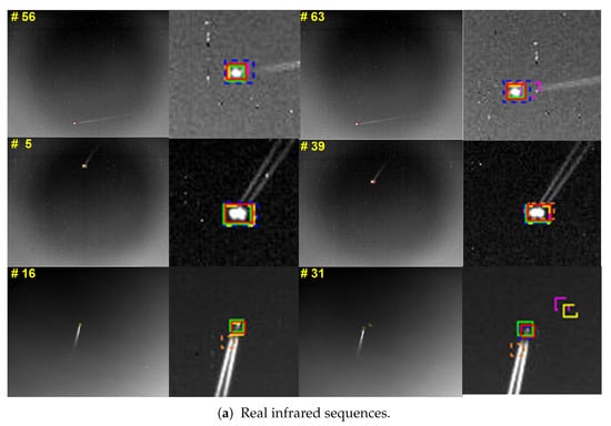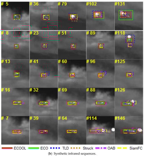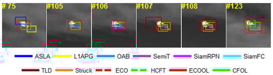 The evaluation follows the OPE protocol used in [], and the details of the dataset used in the experiments are listed in Table 2. The evaluated tracking algorithms are summarized in Table 3. Trackers with dense sampling (TLD, Struck) provide a large search range and achieve better performance. Among the evaluation results, discriminative trackers (ECO [], TLD [], Struck []) perform better than trackers based on generative models (L1APG [], ASLA []). Discriminative trackers employ the information from both the target and background and train a classifier to distinguish the target from the background []. For generative model based trackers, it is difficult to learn the generative appearance model of the target in the complex background. For aircraft tracking in infrared imagery, the aircraft may be frequently occluded by a cloud or an infrared decoy, resulting in inaccurate target models. As seen from Figure 14, ASLA and L1APG drift to the decoy and the cloud in Frame 75. The online update of the ensemble of weak classifiers helps distinguish the target from the background, but it also introduces errors due to frequent updates. SiamRPN and SiamFC benefit from the large training dataset to learn similarity functions. However, they lack an efficient model update mechanism to handle the appearance change, leading to model drift problems. Notice that in Frame 107, TLD lost the target. However, in Frame 108, TLD is re-initialized by its detector and successfully locks onto the target again. Both HCFT and ECO adopt CNN features to improve the performance. Instead of simply resampling all feature channels at the same resolution, ECO adopts continuous convolution operators to integrate feature channels, which enables more accurate localization. After replacing the pre-trained CNN feature with online learning features (CFOL, ECOOL), the performance of the baseline methods are improved. The overall performance is summarized by precision plots and success plots. For clarity, only the top 10 trackers are presented, as shown in Figure 15. Qualitative comparisons with the top-performing trackers are shown in Figure 16.