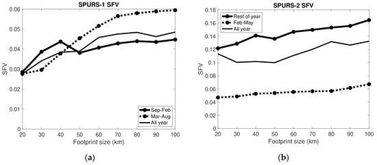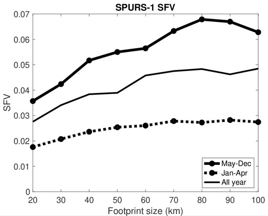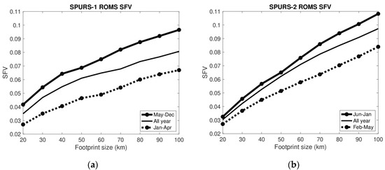 Separating the SFV out during the wet and dry periods (Figure 3), one can see a sharp contrast between the regions. In the SPURS-1 region, SFV increases strongly with footprint size from 20 to 70 km during the dry season, but only out to 40 km in the wet season. SFV is about the same between wet and dry seasons to 40 km. At larger footprint sizes, it is counterintuitively much larger during the dry season. The dry season corresponds to spring and summer, so one has to assume that internal variability is larger during these months than during fall and winter at 50+ km length scales. This seems consistent with [32] who found elevated eddy kinetic energy (EKE) in the SPURS-1 region during the months of April–September. Larger EKE presumably means stronger eddy activity at the mesoscale, and thus larger variability of SSS at that scale as well.