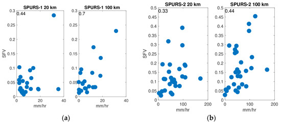 SPURS SFV vs. maximum rain rate measured at the central mooring when this value exceeds 2 mm/hr. Maximum rain rate was determined over the same weekly time intervals as the SFV. Correlation values are shown at the top left of each panel. All are significant at the 95% level, except for SPURS-1 at 20 km which is significant at the 90% level. Left panels: 20 km footprint size. Right panels: 100 km footprint size. (a) SPURS-1. (b) SPURS-2. Note vertical axes are not consistent between the panels.