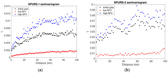 The semivariograms for SPURS-1 are much as one would expect, with small values at small separation, increasing to a plateau (the “sill”) at 50 km or so (the “range”). The semivariogram during the low SFV period is much smaller, but it contains the same dependence on separation distance.