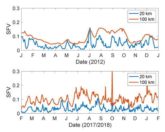 Time series of SFV (Figure 1) in the SPURS regions indicate that it is a seasonal quantity, tending to be largest in summer and fall (June–December) and smallest in winter and spring (January–May). SFV in the SPURS-2 region is larger than SPURS-1, though the difference is least in the low variance season. In most instances, SFV is larger at the 100 km footprint size for both regions. There are isolated time periods when this is reversed, especially in the SPURS-1 region. There tends to be a larger distinction as a function of scale for the SPURS-1 region. That is, for SPURS-1, the ratio of 100 km SFV to 20 km SFV is generally larger than for SPURS-2.