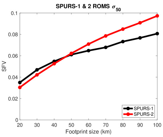 Median SFV (σ50) as a function of footprint size for SPURS-1 (black) and SPURS-2 (red) in situ data.