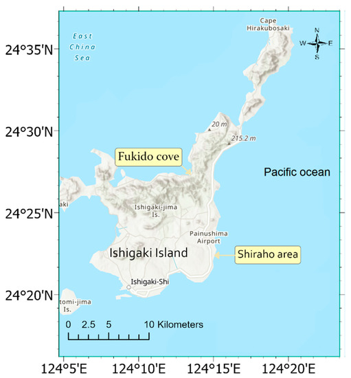 Location of Shiraho and Fukido study areas in Ishigaki Island, Japan (Esri, USGS, Open Street maps).