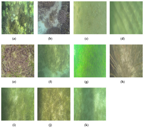 Examples of towed images that were used for benthic habitats and seagrass identification. (a) Corals, (b) blue corals, (c) soft sand, (d) sediments, (e) brown algae, (f) algae, (g) seagrass, (h) E. acoroides, (i) tall T. hemprichii, (j) small T. hemprichii, (k) seagrass sparse areas.