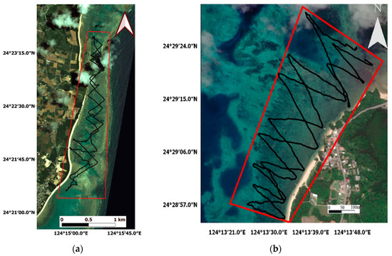 The field surveys in Ishigaki Island, Japan: (a) Shiraho area over Quickbird satellite imagery (b) Fukido cove over Geoeye-1 satellite imagery.