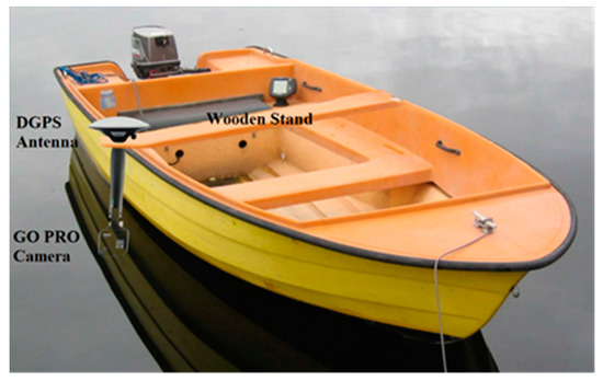 Field data from the Shiraho benthic habitats and Fukido seagrass species were collected during the typhoon season on 21 and 28 August 2016, respectively. Moreover, the rainfall acquired prior to the data acquisition times increased the outflows from the major tributaries, Todoroki River for Shiraho reef and Fukido River for Fukido cove. However, the turbidity level was higher in Fukido cove than the Shiraho area. The Fukido cove muddy substrate and that it is near to the Fukido River mouth explain the high turbidity level. Two field surveys were performed to collect underwater images using a high-resolution towed video camera (GoPro HERO3 Black Edition) [37] (Figure 3), which was attached with a wooden stand to a motorboat side, thus that it was placed directly beneath the water surface. In addition, the coordinates of the surveyed underwater images were recorded using a differential global positioning system (DGPS) mounted vertically above the camera (Figure 4). At each site, about 4 h of recordings were collected; these were then converted to underwater images using free video-to-image converter software. The extracted images had 1 second time intervals that were synchronized with the DGPS observations. Finally, 3000 benthic habitat images were labeled as 7 classes, while 1500 seagrass images were labeled as 4 categories. The images were labeled manually to construct benthic habitat- and seagrass species-detection schemes.